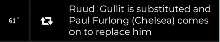 And to be fair, Glenn’s done me here. Bringing off one of the great players of the 20th century and replacing him with Paul Furlong. I’m not sure even Eileen Drewery saw that coming.