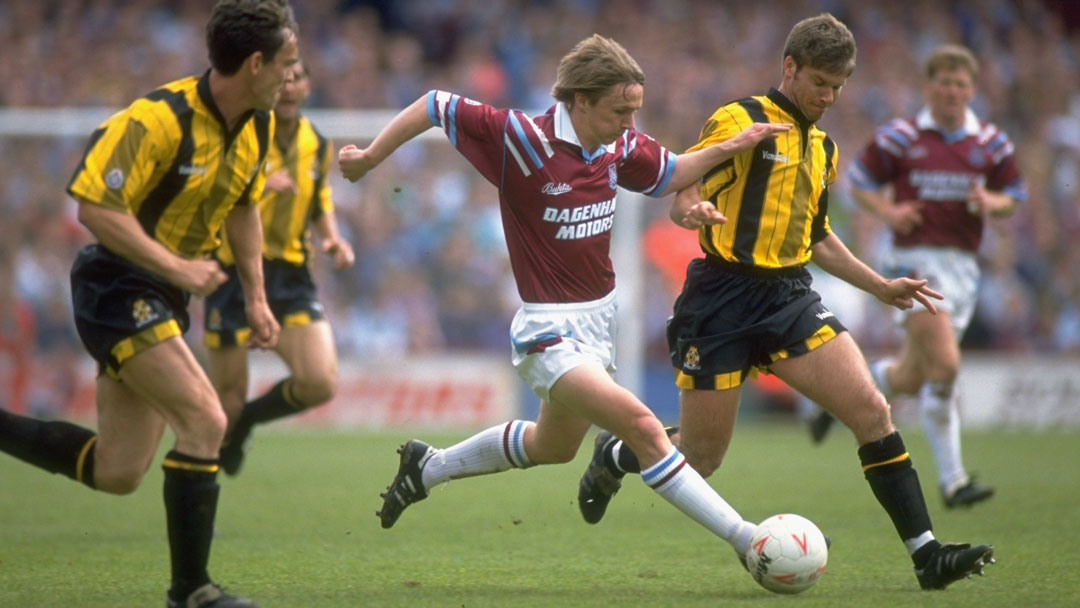 West Ham United clinched promotion to the Premier League on the final day of the 92/93 season when they beat Cambridge United 2-0 at Upton Park to pip Portsmouth to the runners-up spot behind champions Newcastle United. David Speedie and Clive Allen grabbed the important goals for the Hammers.