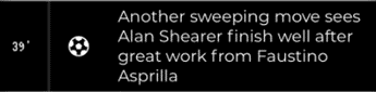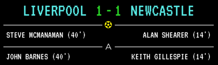 The tactic works a treat as we boss the first 20 minutes. It’s like watching Johan Cruyff’s Total Voetball Dutch side of the 1970s, with a couple of reducers from David Batty thrown in. We get the reward our possession deserves when Shearer, on his own against three centre halves who are defending their penalty area like it’s littered with landmines, finds space to steer us in front.