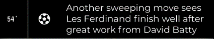 The second half brings more of the same. Merrington’s stubborn refusal to switch tactics cost the home side. Gascoigne’s enjoying more time and space than Neil Armstrong did on the surface of the moon, and it’s no surprise when he slots in Les Ferdinand for a third.