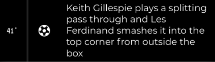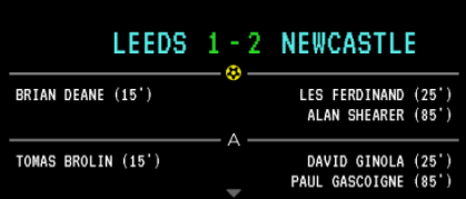The game itself is a niggly, nervy affair, lit up by one moment of magic by David Ginola. The Frenchman’s cross finds Tino who taps in the only goal of an otherwise terrible game.