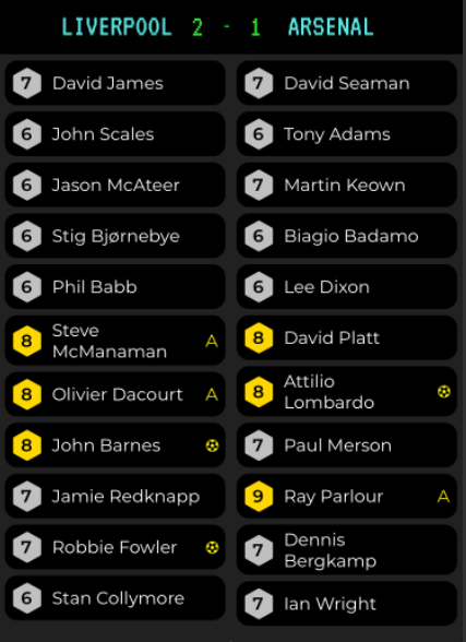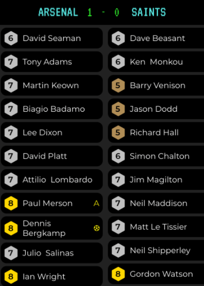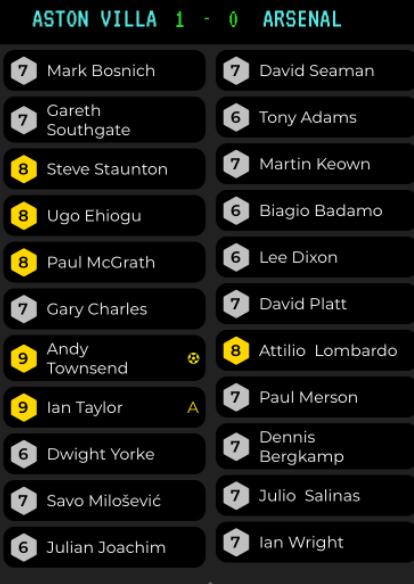 Any thought that Arsenal will try and hit us on the break disappear once I see their line-up. A front three of Wright, Bergkamp and Salinas, ably assisted by Merson, Platt and Lombardo. It’s going to be a shootout between the top tier’s top scorers.