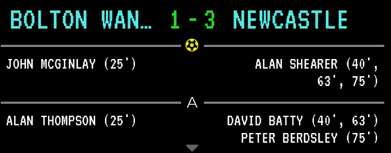 The goal bonanza continues at Bolton where Shearer nets another three to take his tally to six in three games. He’s ably assisted, in every sense, by the cultured feet of David Batty who seems to have momentarily mistaken himself for Glenn Hoddle.