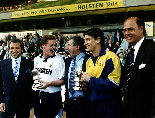 During his time at White Hart Lane, Gary Lineker was nicknamed Golden Bollocks after becoming the Golden Boot winner at the Mexico 1986 World Cup. Here he he with Tottenham Hotspur manager Terry ‘El Tel’ Venables and midfield maestro Paul Gascoigne enjoying a pre-match laugh whilst showcasing the miniature versions of the FA Cup they had won earlier that year.