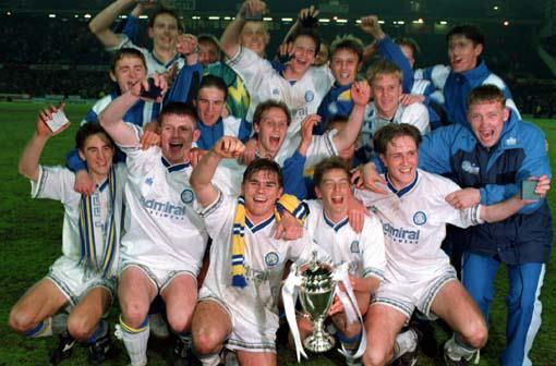 The 1992 FA Youth Cup winners, Manchester United travelled across the M62 to take on a talented Leeds United youth side in the 2nd leg of the 1993 Youth Cup Final. The Yorkshire side managed by Paul Hart had a two goal first leg advantage over Eric Harrison’s Reds thanks to goals from Jamie Forrester and Noel Whelan in front of a 30,562 crowd at Old Trafford. Another big 31,037 crowd at Elland Road roared the Peacocks on to a 2-1 2nd leg victory with goals from Jamie Forrester and Matthew Smithard to help Leeds United win the FA Cup Youth Cup for the first time in their history.