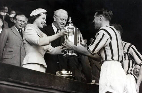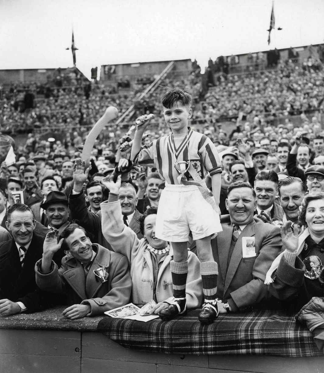 A young Villa fan is kitted out and ready for the 1957 FA Cup final action to begin between Aston Villa and Manchester United. At the final whistle the young boy was celebrating the Villans seventh FA Cup title which also remains the last time they won it!