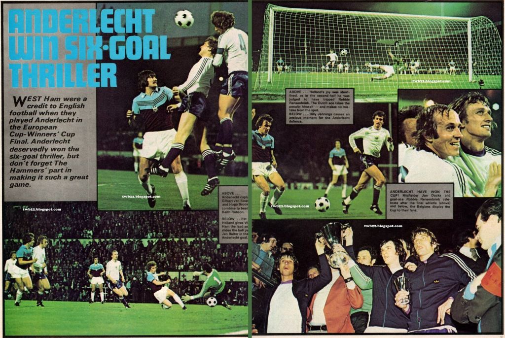 With confidence high the team started 1975-76 and were top in November but then went on a disastrous run in 1976 winning just one of their final 22 league matches and winding up in 18th place just six points above the relegation zone (22-team league and 2 points for a win). That disappointment was eased by magnificent form in the European Cup-Winners’ Cup competition, overcoming 4-0 deficit at half time in the first leg against Den Haag to with the quarter-final on away goals and a 2-1 first leg deficit on the semi-final to beat Eintracht Frankfurt 4-3 on aggregate. The Final at Heysel Stadium in Brussels ended in a 4-2 defeat to Anderlecht but the die had been cast with the league form.