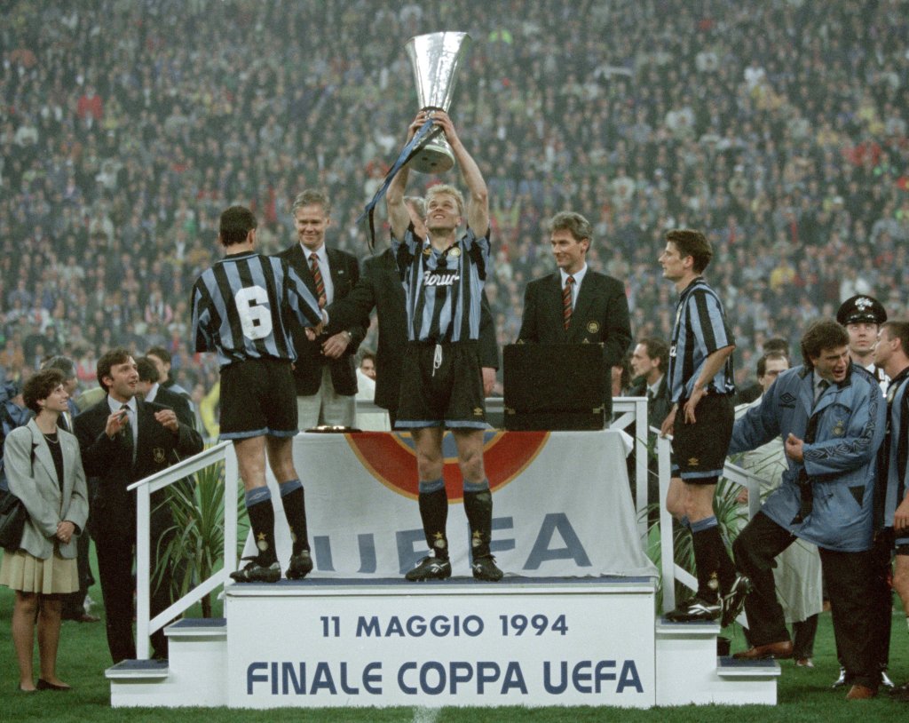 The flying Dutchman, Dennis Bergkamp and his fellow countryman Wim Jonk bagged thirteen goals between them throughout the 1993/94 UEFA Cup run for Inter Milan. Dennis was joint top goal scorer with eight goals but Wim scored the decisive goal in the final to secure a second UEFA Cup title for the Nerazzurri. Watch the winning goal here
