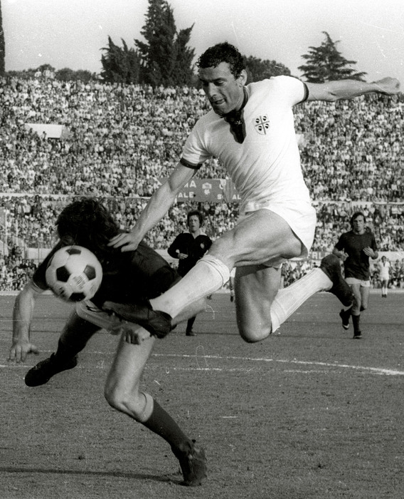 As a player, he was the complete athlete: standing almost six feet, he was well built with great upper-body strength and the kind of engine that allowed him to run all day long and burst past opponents with ease. But that still wasn’t it. The single most identifiable feature of Luigi Riva as a player was an absolute cannon of a left foot that allowed him to strike from distance with power and accuracy on a regular basis. It earned him the fantastic nickname of Rombo di Tuono, literally “Roar of Thunder” and never has such a moniker seemed more fitting. Technically gifted, he had a fantastic first touch and was also a free-kick specialist, but it was the sight of him running at speed with the ball at his feet, barrelling defenders out of his way as he ran directly toward goal that would put the fear of god into the opposition and make fans of both teams rise to their feet in expectation of one of his specials.